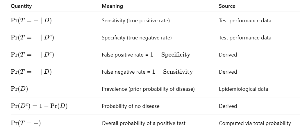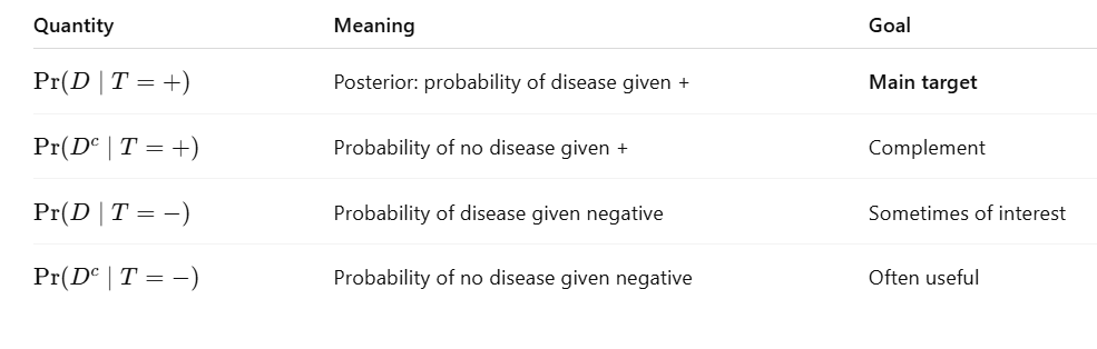 I hope these tables can keep you on the track now. As you can see, our goal is to estimate $\Pr(D \mid T=+)$.