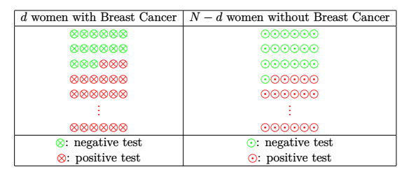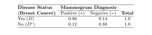 Assume that the proportion of females having breast cancer is 0.01. This means that out of 1000 women, only one has the decease. Using the information provided by the table, we compute
